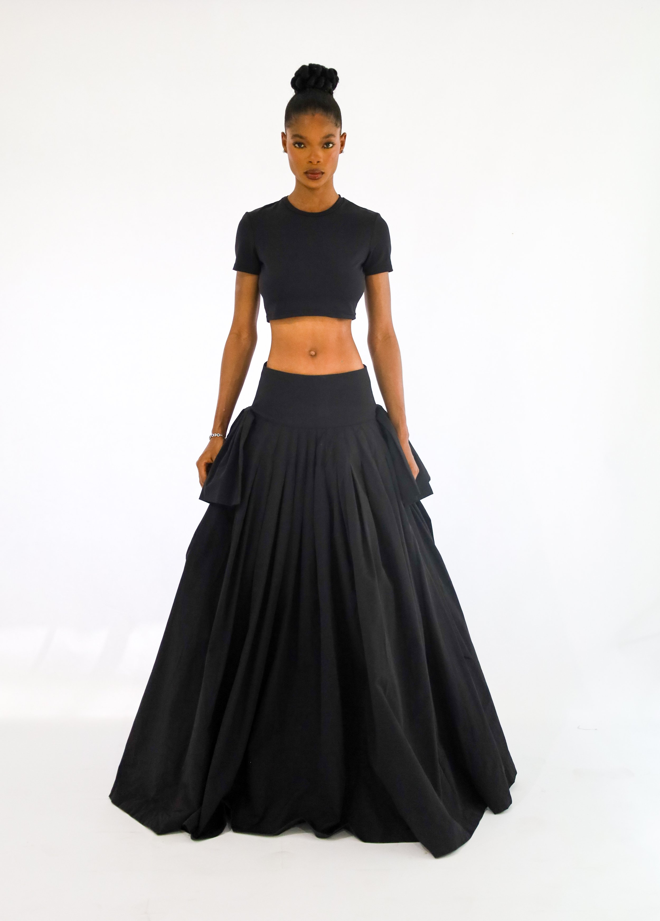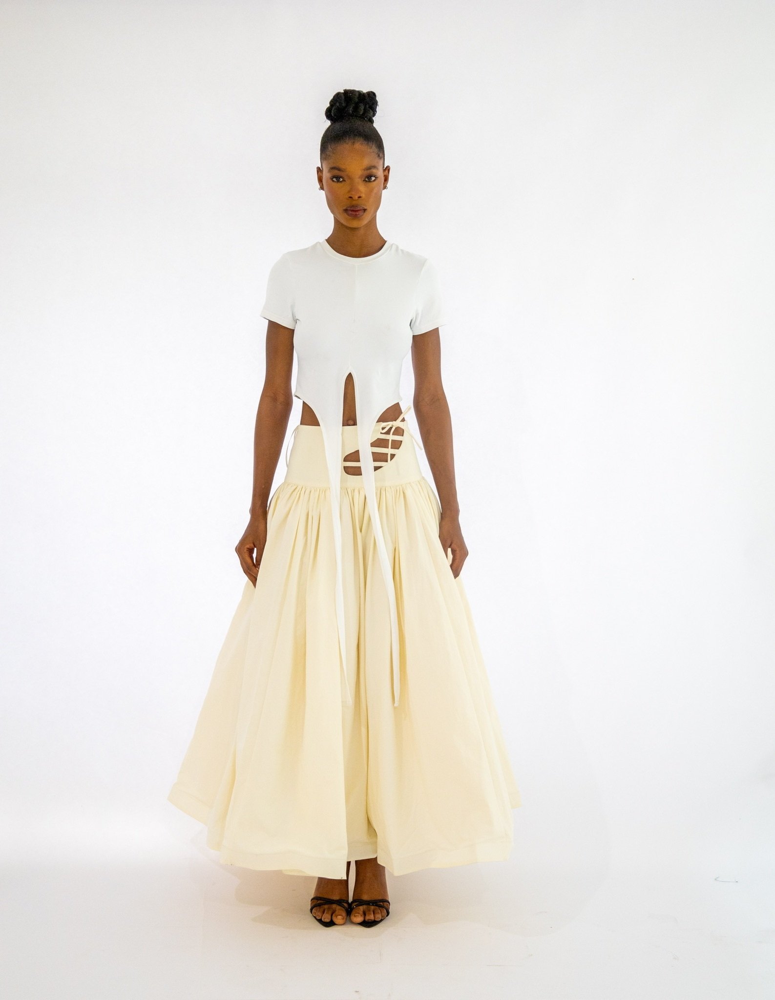 And speaking of swirls, the Tutu Looped Mini Skirt takes it further—made with cotton and detailed with denim loops that dance all around the skirt, it’s the perfect match to the top and a fun statement on its own.
